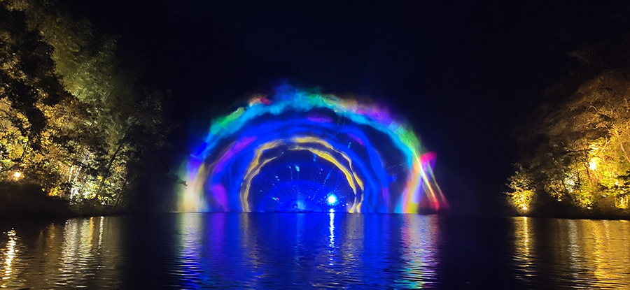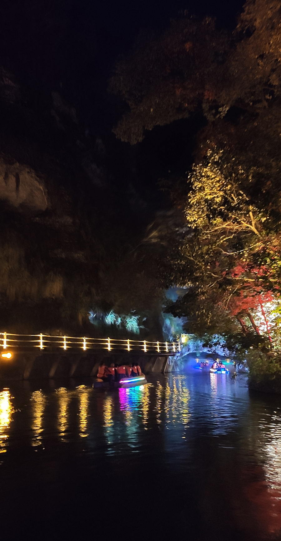 入夜,黨支部一行來到本次文旅最精彩的項目:“夜游九龍?zhí)?rdquo;。以“夜游九龍?zhí)叮o享夜的美”為主題的“行進(jìn)式”水上峽谷夜游景區(qū),利用現(xiàn)代化聲光技術(shù)與景區(qū)自然美景有機融合,讓您充分感受“詩意山水,光影幻境”。聽蛙唱蟲奏,觀月下仙境,月光映水,水波映月,加上臨水棧道邊笛聲陣陣......讓您真切的領(lǐng)會空靈、幽靜、夢幻的別樣意境。一路的聲光風(fēng)景讓人目不暇接,如果不是身臨其境,絕對感受不到那光影與大自然結(jié)合產(chǎn)生的絕妙意境。