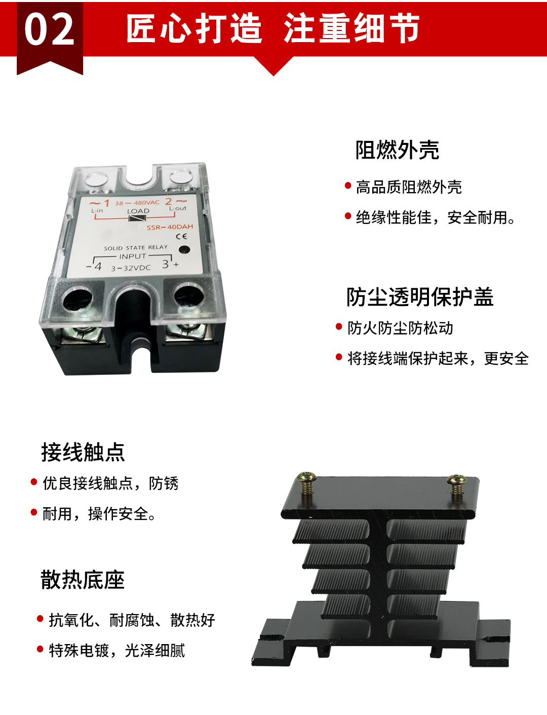 NHR-SSR固態(tài)繼電器尺寸小巧,內(nèi)置壓敏電阻及阻容吸收回路,具有吸收電網(wǎng)尖峰電壓抗干擾能力。可通過動(dòng)作指示燈來檢查工作狀態(tài),寬電壓輸出,可達(dá)到AC38-480V,低觸發(fā)電流小干8mA。