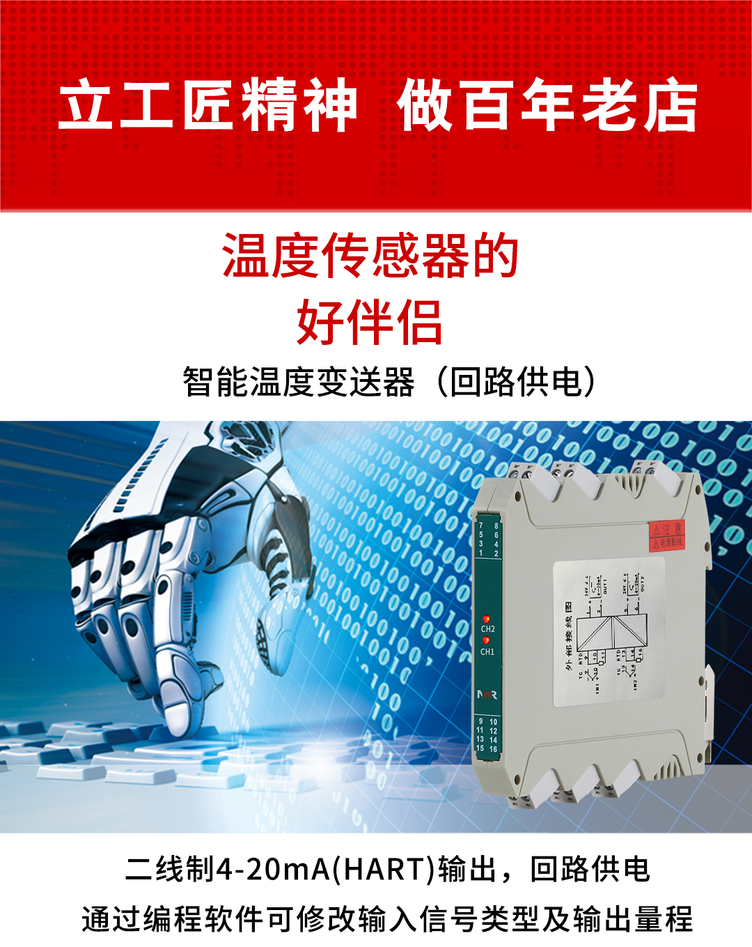 回路供電溫度變送器分為M213智能溫度變送器、M214隔離智能溫度變送器、M215 HART智能溫度變送器,變送器將現(xiàn)場的熱電阻或熱電偶信號經(jīng)過隔離放大處理,轉(zhuǎn)換為與溫度成線性的二線制4-20mA(HART)信號輸出至控制系統(tǒng)。