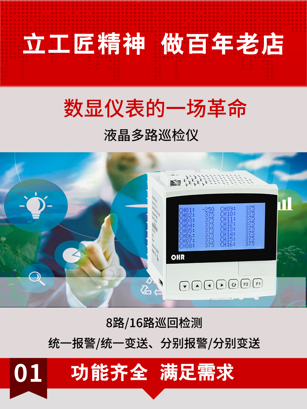 虹潤公司是專業(yè)生產(chǎn)多路溫度巡檢儀的國家專精特新“小巨人”企業(yè),生產(chǎn)的液晶多路巡檢儀,具有8路/16路測量通道,全切換信號輸入,統(tǒng)一報警統(tǒng)一變送輸出,分別報警分別變送輸出,RS485/RS232通訊等特點。產(chǎn)品獲得巡回檢測顯示方法及裝置、儀表殼體等2項國家發(fā)明專利,主持起草工業(yè)過程控制系統(tǒng)用模擬輸入兩位或多位輸出儀表、物聯(lián)網(wǎng)智能溫度儀表通用技術條件等2項國家標準,以及通信系統(tǒng)多通道數(shù)據(jù)采集控制終端規(guī)范軍用標準,參與國際5G標準制定,取得液晶多回路測量顯示控制儀等4項相關軟件著作權。產(chǎn)品廣泛應用于電力、石化、冶金、制藥、水處理、機械配套等各種工業(yè)現(xiàn)場。