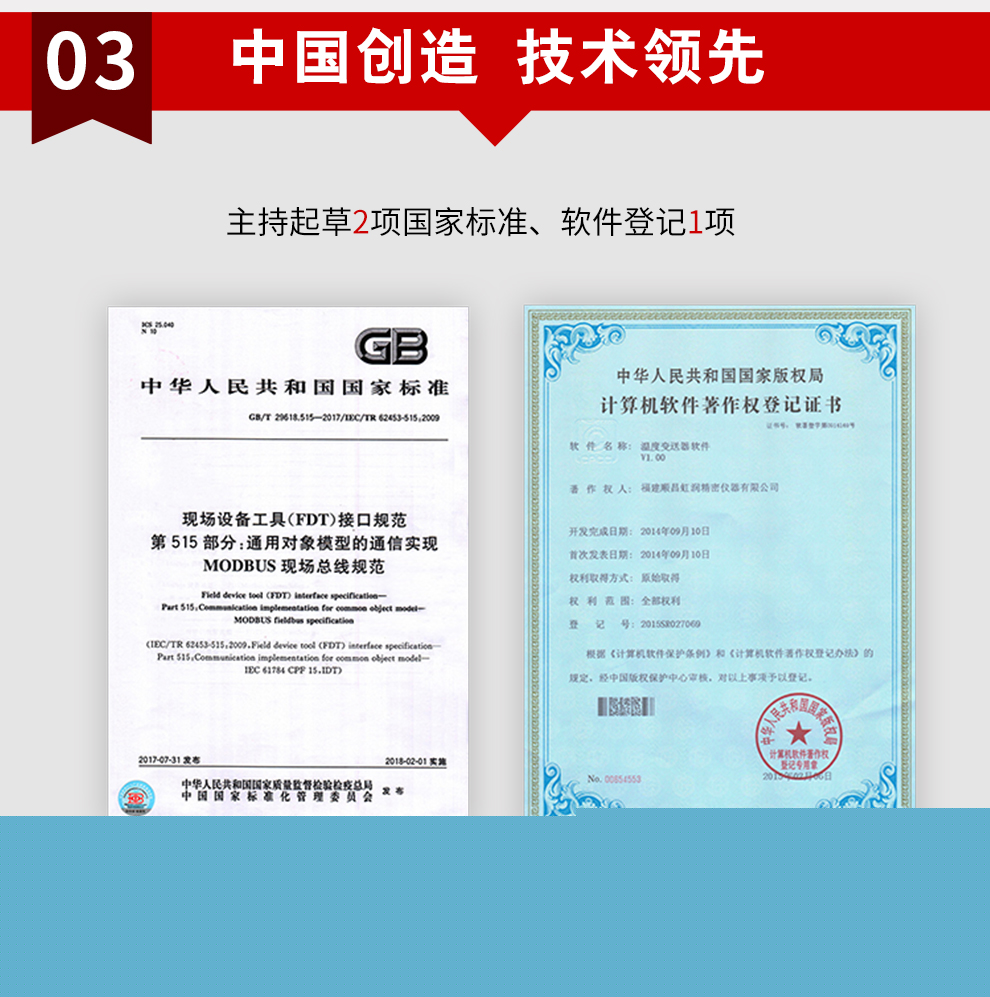 虹潤公司是專業(yè)生產(chǎn)溫度變送器的國家專精特新“小巨人”企業(yè)。生產(chǎn)的現(xiàn)場顯示隔離溫度變送器,具有可修改輸入信號類型,測量精度高,穩(wěn)定性好,帶HART或RS485通訊計等特點。該產(chǎn)品不僅通過德國萊茵 CE 認(rèn)證與 SIL 功能安全認(rèn)證,還獲得具備減震抗干擾能力的溫度變送器、信號隔離器、一種二端子模塊、無源信號隔離器等3項國家發(fā)明專利。主持起草物聯(lián)網(wǎng)智能溫度儀表、現(xiàn)場設(shè)備工具(FDT)接口規(guī)范、工業(yè)過程測量和控制系統(tǒng)用溫度變送器等3項國家標(biāo)準(zhǔn),以及通信系統(tǒng)多通道數(shù)據(jù)采集控制終端規(guī)范軍用標(biāo)準(zhǔn)。參與國際5G標(biāo)準(zhǔn)制定,取得高精度溫度變送器等3項相關(guān)軟件著作權(quán)。產(chǎn)品廣泛應(yīng)用于石油、化工、電力、冶金、制藥、食品、水處理等各種工業(yè)領(lǐng)域。