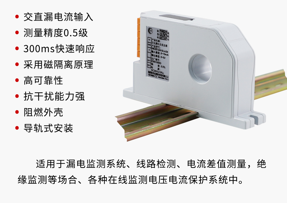 OHR-ES30系列交流/直流漏電流變送器對(duì)電網(wǎng)和電路中的交直流電流信號(hào)進(jìn)行實(shí)時(shí)測(cè)量,具有高精度、高隔離、 低漂移、低功耗、體積小、響應(yīng)快、抗干擾能力強(qiáng)等特點(diǎn)。本產(chǎn)品采用標(biāo)準(zhǔn)DIN35mm導(dǎo)軌安裝,端子接線,安裝方 便,適用于測(cè)量漏電監(jiān)測(cè)系統(tǒng),線路檢測(cè),電流差值測(cè)量,絕緣監(jiān)測(cè)等場(chǎng)合。