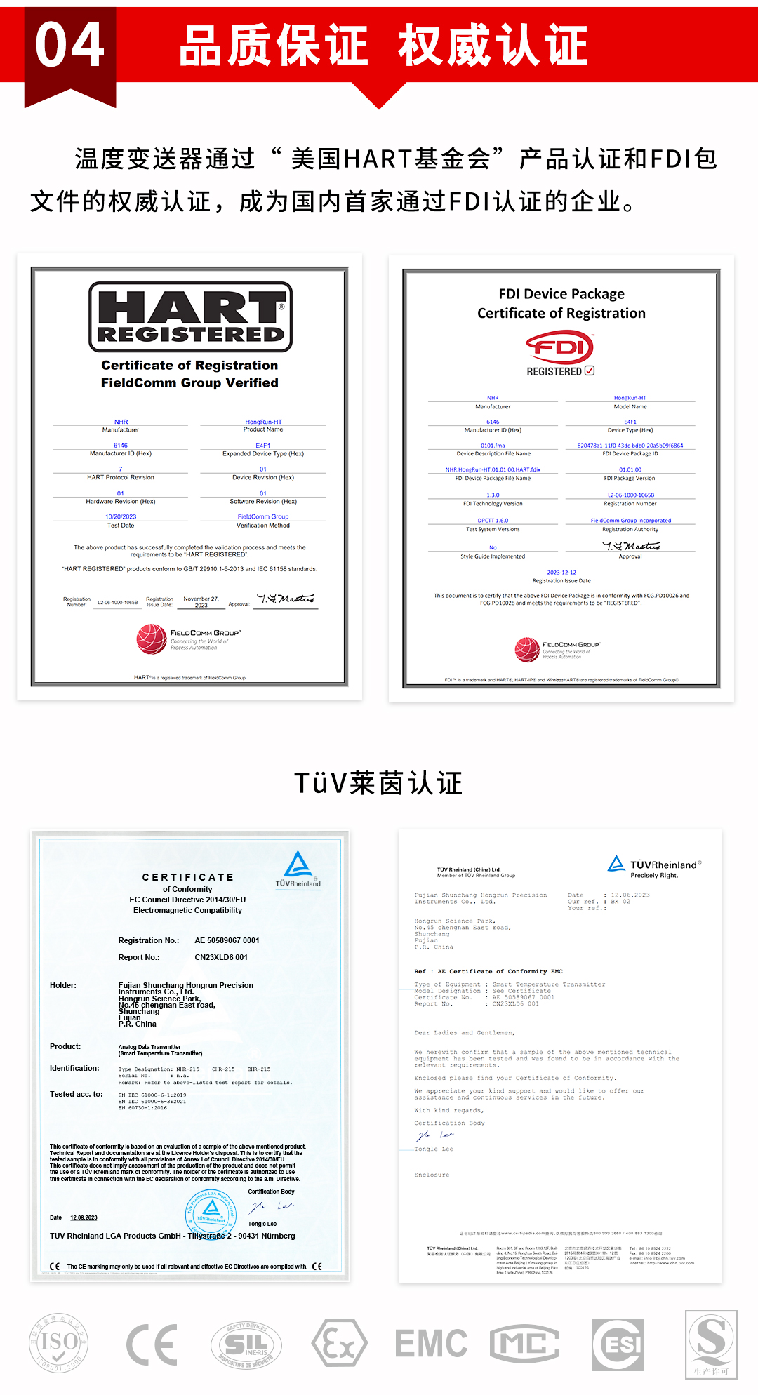虹潤公司是專業(yè)生產(chǎn)溫度變送器的國家專精特新“小巨人”企業(yè)。生產(chǎn)的智能溫度變送器,具有適配各類溫度傳感器,精度高,通過編程線修改輸入信號(hào)類型及量程,高抗干擾,HART或485通訊等特點(diǎn)。該產(chǎn)品不僅通過HART基金會(huì)認(rèn)證、德國萊茵 CE 認(rèn)證與 SIL 功能安全認(rèn)證,還獲得具備減震抗干擾能力的溫度變送器、信號(hào)隔離器、一種二端子模塊、無源信號(hào)隔離器等4項(xiàng)國家發(fā)明專利,主持起草物聯(lián)網(wǎng)智能溫度儀表、現(xiàn)場(chǎng)設(shè)備工具(FDT)接口規(guī)范、工業(yè)過程測(cè)量和控制系統(tǒng)用溫度變送器等3項(xiàng)國家標(biāo)準(zhǔn),以及通信系統(tǒng)多通道數(shù)據(jù)采集控制終端規(guī)范軍用標(biāo)準(zhǔn),參與國際5G標(biāo)準(zhǔn)制定,取得HART溫度變送器、智能溫度變送器等3項(xiàng)相關(guān)軟件著作權(quán)。產(chǎn)品廣泛應(yīng)用于石油、化工、電力、冶金、制藥、食品、水處理等各種工業(yè)領(lǐng)域。